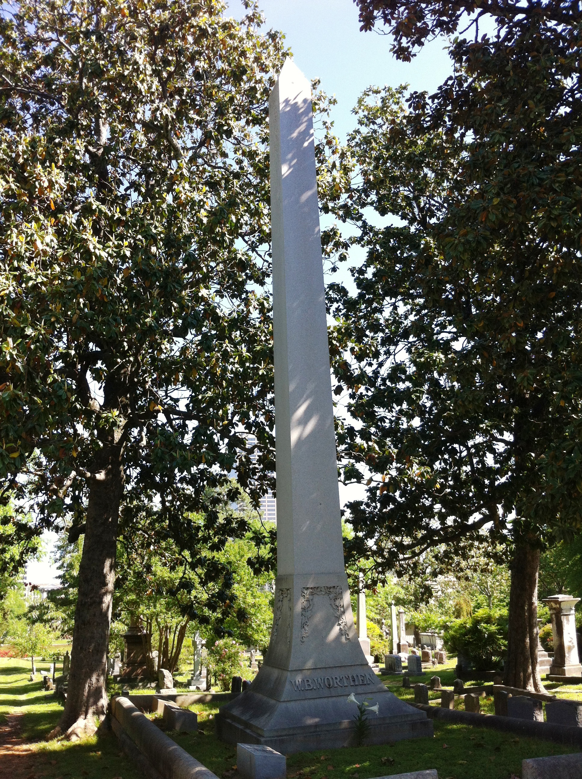 The obelisk is the tallest structure in Mt. Holly Cemetery and is likely the tallest monument in Little Rock. Though it is still a very impressive structure, the trees which have grown up along side of it now obscure the obelisk from view outside of the cemetery.