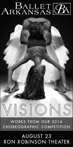 BA_VISIONS_600x300ad_25july2014Ballet Arkansas kicks off the season tonight with their first annual Visions Choreographic Competition.  It will take place in the CALS Ron Robinson Theater in the River Market at 7:00 pm.