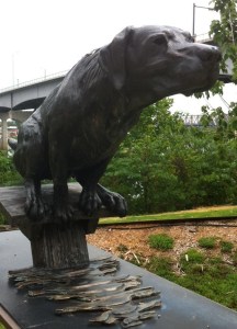 Ken Newman’s FOREVER READY was donated in 2009 by the Sculpture at the River Market. It is sited in the Vogel Schwartz Sculpture Garden. Mr. Newman is a member of the National Sculptors’ Guild. One of Mr. Newman’s specialties is animals. Cast in bronze, Forever Ready depicts a Labrador. Here is Mr. Newman’s artist statement on the piece.