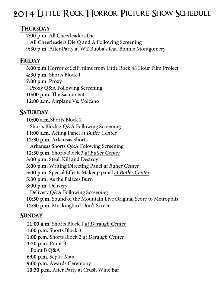 The Made in Arkansas line up is pretty big this year. Not only are is the LRHPS showing a feature made in Arkansas, the festival is also showing the horror/sci-fi films from last year’s 48 Hour Film Project along with a wonderful line up of horror shorts from all over Arkansas.