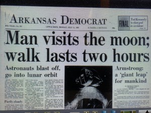 On July 20, 1969, at 3:17 pm (Little Rock time), the lunar module Eagle set down in the Sea of Tranquility on the moon. Astronaut Neil Armstrong radioed to Mission Control in Houston, “The Eagle has landed.”