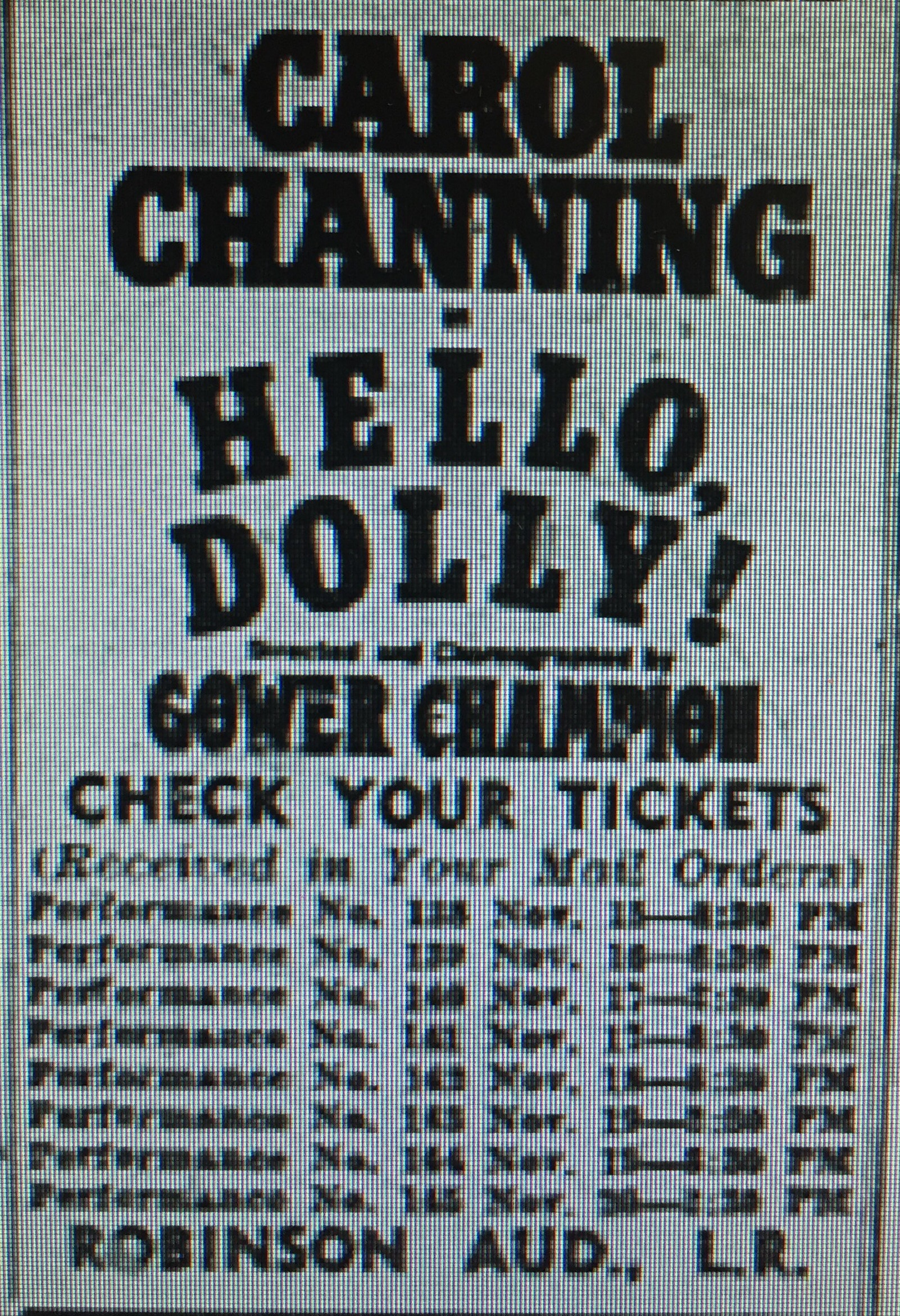 53 years ago tonight, on November 15, 1966, Carol Channing opened a six day stint in HELLO, DOLLY! at Robinson Auditorium. She would play 8 sold out shows over those six days.