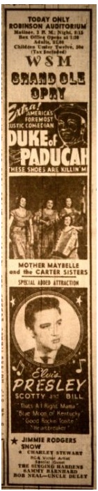 His first appearance at Robinson was on February 20, 1955. Billed as the “WSM Grand Ole Opry” show, Elvis Presley was third on the bill behind the Duke of Paducah and Mother Maybelle and the Carter Sisters as he began week long tour of Arkansas and Louisiana. On this date there were a pair of shows, at 3:00 and 8:15 p.m., at Robinson Auditorium. Tickets were 75-cents in advance, $1.00 at the box office and 50-cents for kids. It is believed that Gladys and Vernon Presley attended this performance, invited by Elvis who wanted to introduce them to the Colonel. Gladys was a big fan of the Duke of Paducah. Elvis Presley, Scotty Moore, and Bill Black receive $350 for these two shows instead of their usual $200 per day. In August 1955, he returned and played Robinson as part of the All-Star Jamboree.