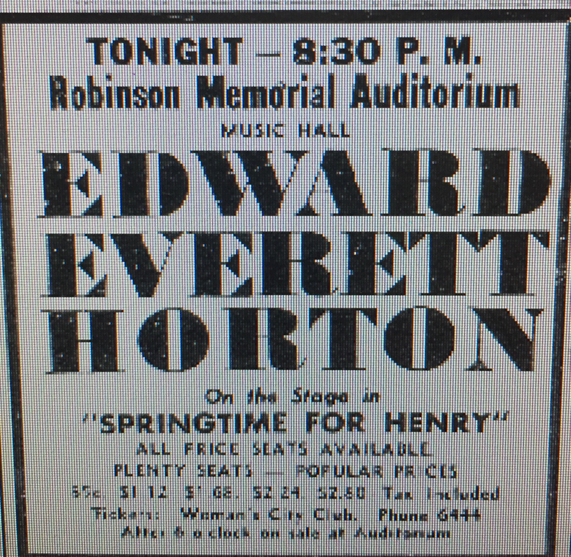 On April 1, 1940, stage and screen star Edward Everett Horton appeared in the comedy Springtime for Henry in the music hall of Robinson Auditorium. This was the first play to be featured on the stage of the Music Hall which had opened six weeks earlier.