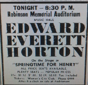 On Monday, April 1, 1940, Edward Everett Horton came to Little Rock in the comedy SPRINGTIME FOR HENRY.  This was a play in which he had appeared regularly on tours and in summer stock. He would create productions of it in between film roles from the 1930s to the 1950s.