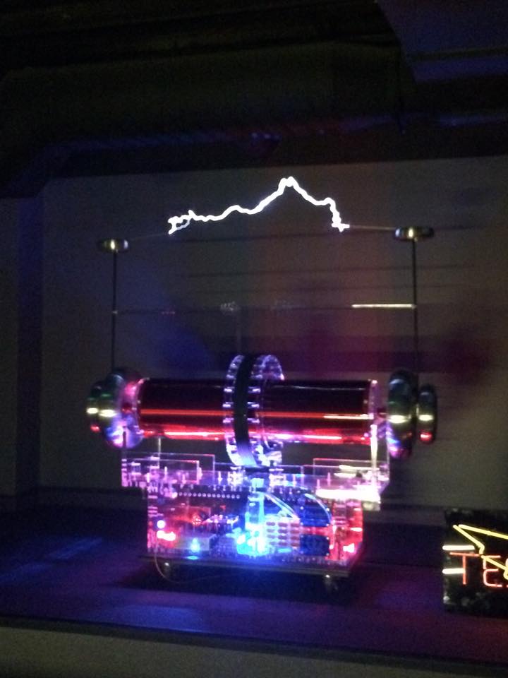 The device, which can produce 200,000 volts of electricity, was built by Goodchild Engineering in Arizona and donated to the Museum of Discovery by Richard Mathias, founder and president of Tesla Coil Museum Exhibit Program, LLC, through a matching grant program from the General Electric Foundation.