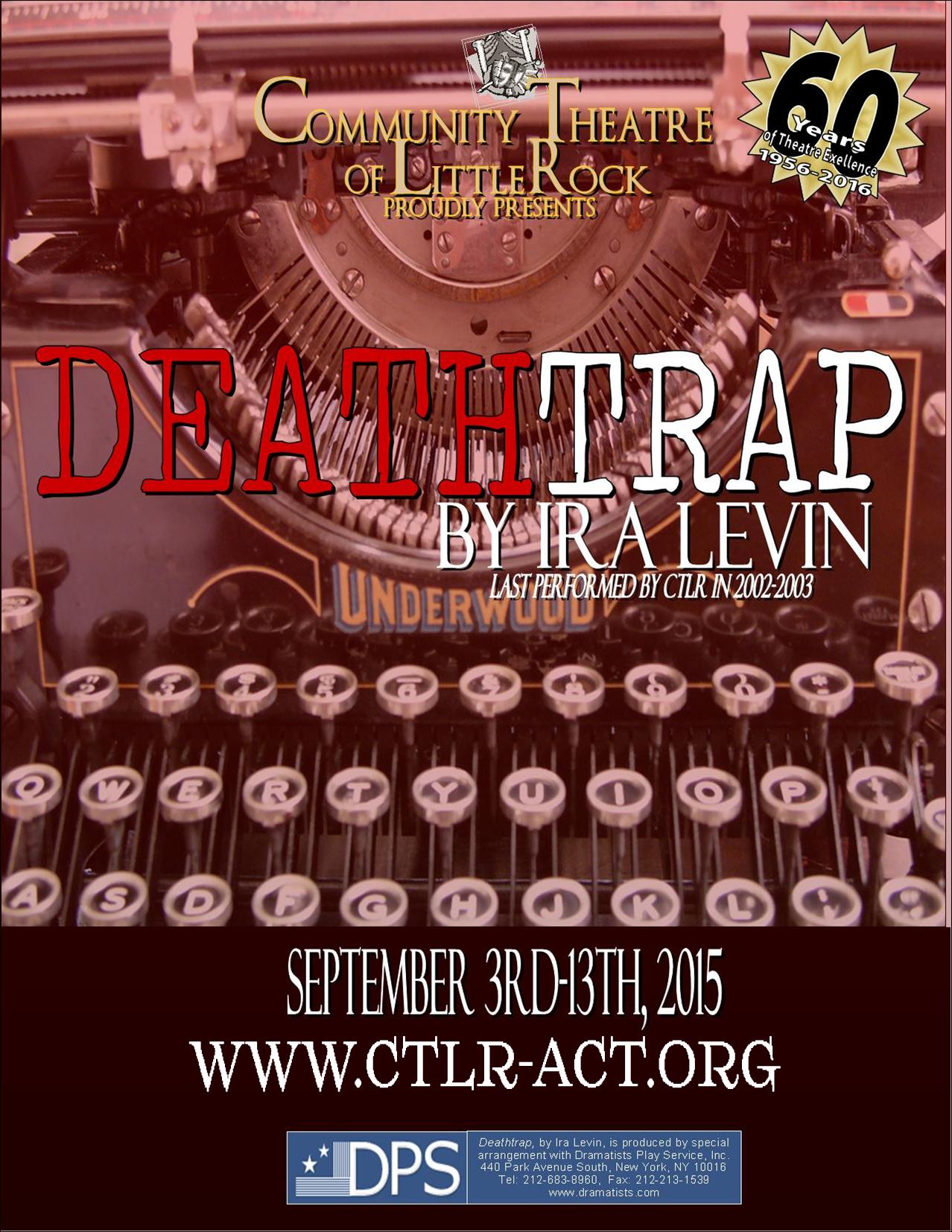 CTLR DeathtrapThe Community Theatre of Little Rock begins its 60th Season with the Tony-nominated murder mystery Deathtrap by Ira Levin.  It opened on September 3rd and continues tonight, tomorrow afternoon at September 10-13th The Studio Theatre, 320 West 7th Street in downtown Little Rock.