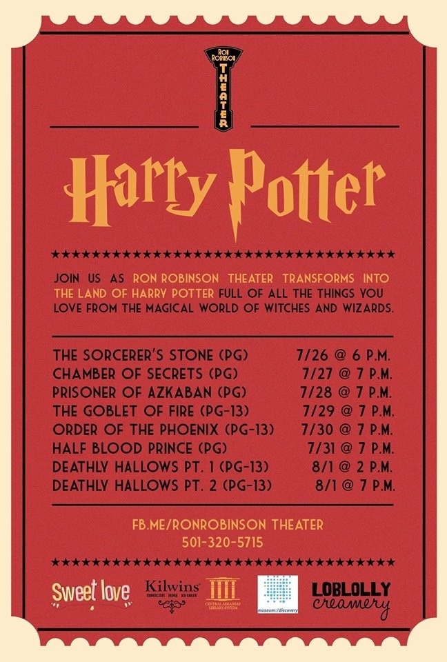 The screening of all eight movies from Sunday, July 26 – Saturday, August 1 will celebrate Harry Potter’s July 31 birthday. Special Harry Potter-themed concessions, activities, and prizes are part of the festivities at 100 River Market Avenue.