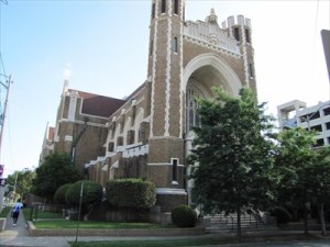 The congregation’s first permanent structure was at the southeast corner of Second and Main (where the Main Street Parking Deck is sited). In 1853, it moved to land on Markham between Cumberland and Rock. Following an 1866 fire which destroyed the church and several other buildings, the church made plans to move. In 1869, the congregation moved to three lots at the northwest corner of Capitol Avenue and Scott Streets. This brick sanctuary with a steeple was the first church built in Little Rock after the Civil War.