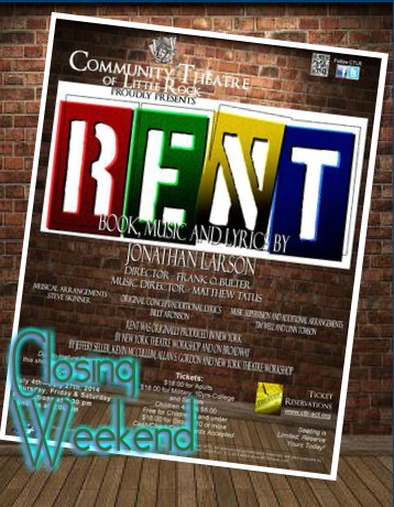 Two other productions are closing this weekend. Community Theatre of Little Rock’s Rent closes on Sunday at the new Studio Theatre space. Winner of both the 1996 Pulitzer Prize and Tony for Best Musical, Jonathan Larsen’s musical is an updated version of La Boheme. Directed by Frank O. Butler with music direction by Matthew Tatus, tickets for this production range from $8 to $18.
