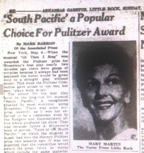 Sixty-eight years ago today, a fictional Little Rock heroine took the stage of a Broadway megahit when South Pacific opened at the Majestic Theatre on April 7, 1949. It settled in for a run of 1925 performances. Based on the James Michener Pulitzer Prize winning novel Tales of the South Pacific, it featured a book by Oscar Hammerstein II and Joshua Logan, songs by Richard Rodgers and Hammerstein and direction by Logan. It was produced by Rodgers, Hammerstein, Logan and Leland Hayward. Set in the titular islands, it concerned the relationships of sailors, nurses, island natives and other island inhabitants.
